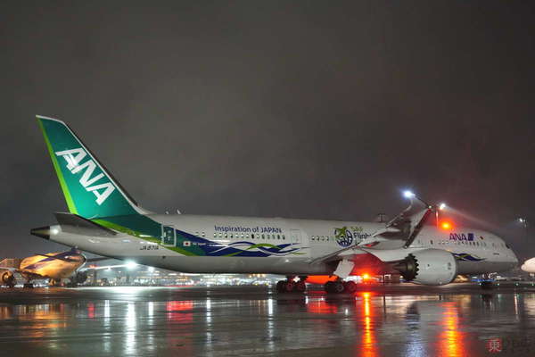 「ANAグリーンジェット」は、ANAグループが持続可能な社会の実現と企業価値向上を目指し立ち上げたプロジェクト「ANA Future Promise」の取り組みをアピールするもので、選ばれた機体は、ボーイング787-9国際線仕様機「JA871A」です。同機は、特徴的な緑の尾翼だけではなく、胴体にANAのコーポレートカラーである青、左側には葉をモチーフとしたライン、右側に水をモチーフとしたラインが描かれており、左右非対称のデザインが特徴です。