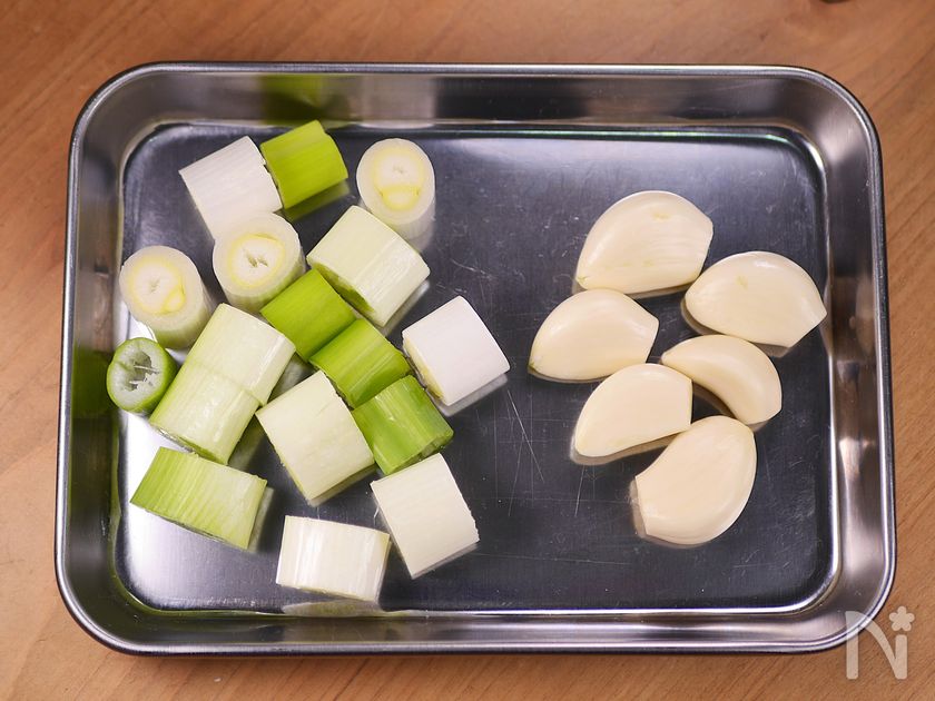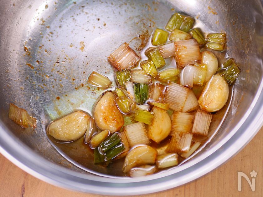 (2) 小鍋(又はフライパン)にサラダ油、にんにく、白ねぎ、塩ひとつまみ(分量外)を入れ、弱火でじっくりとこんがり揚げ焼きにする。