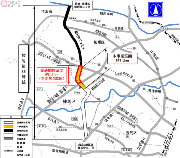開通するのは、環八通りの「平和台駅前」交差点(東京メトロ有楽町線 平和台駅の直上)から、川越街道の「新大宮バイパス入口」交差点までです。これにより環八通りと新大宮バイパスが直結され、交通の円滑化が図られるとともに、生活道路へ流入する通過交通が減少するなど、安全性の向上が期待されるといいます。