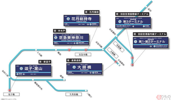 大師線の産業道路駅は「大師橋」駅に、本線の花月園前駅は「花月総持寺」駅に、仲木戸駅は「京急東神奈川」駅に、逗子線の新逗子駅は「逗子・葉山」駅にそれぞれ改称される予定です。
