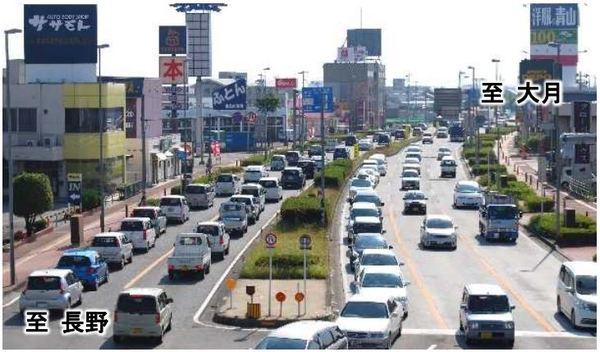 甲府市周辺は、東西に伸びる国道20号と、静岡方面からくる交通、秩父方面からくる交通が合わさる結節点となっており、交通集中が激しく渋滞が課題となっています。