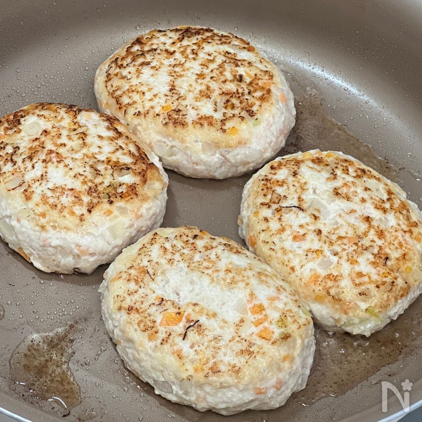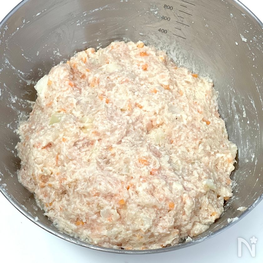 (1) ボウルに、鶏ひき肉・絹豆腐・玉ねぎ・にんじん・塩こしょう・パン粉を入れよく混ぜる。