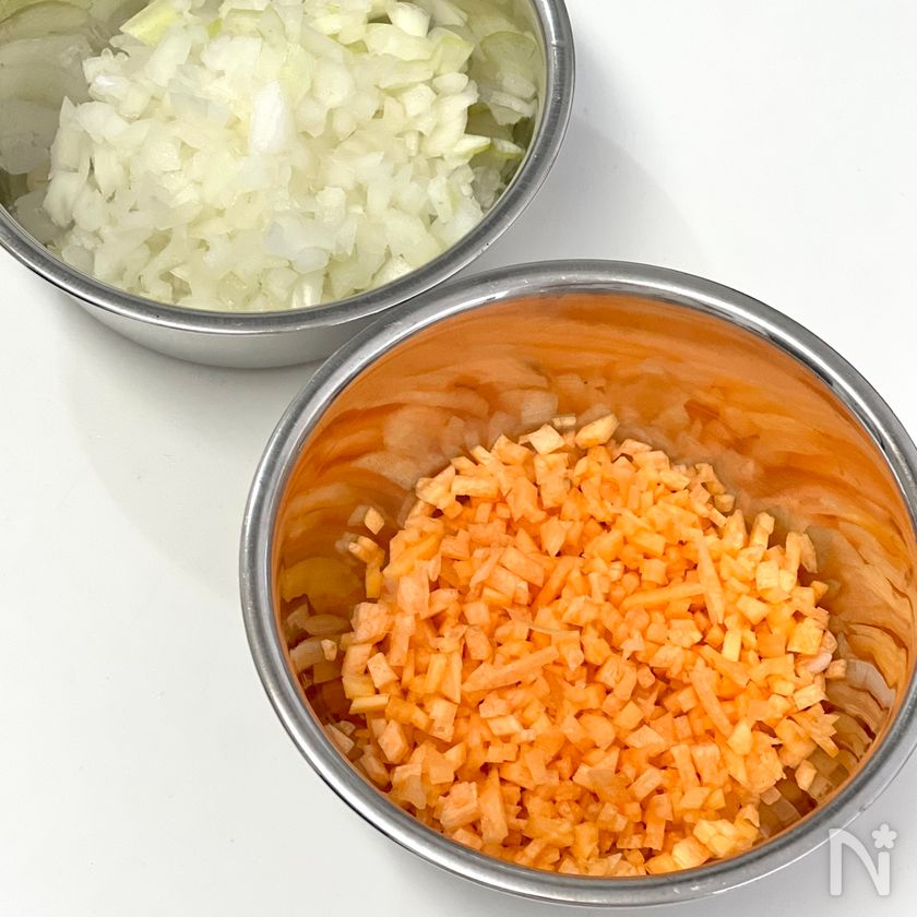 ・玉ねぎ・にんじんはみじん切りにする。