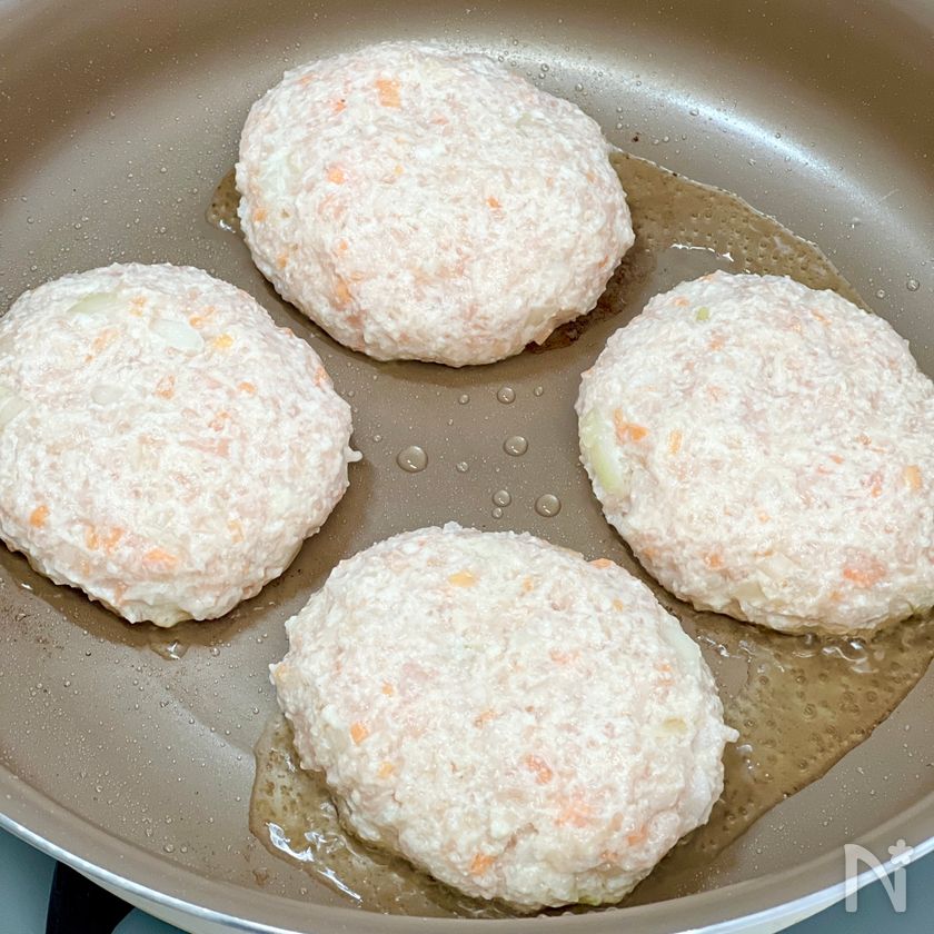 (2) 4等分に分け、楕円形に成形したら、サラダ油を中火で熱したフライパンで片面2分焼く。