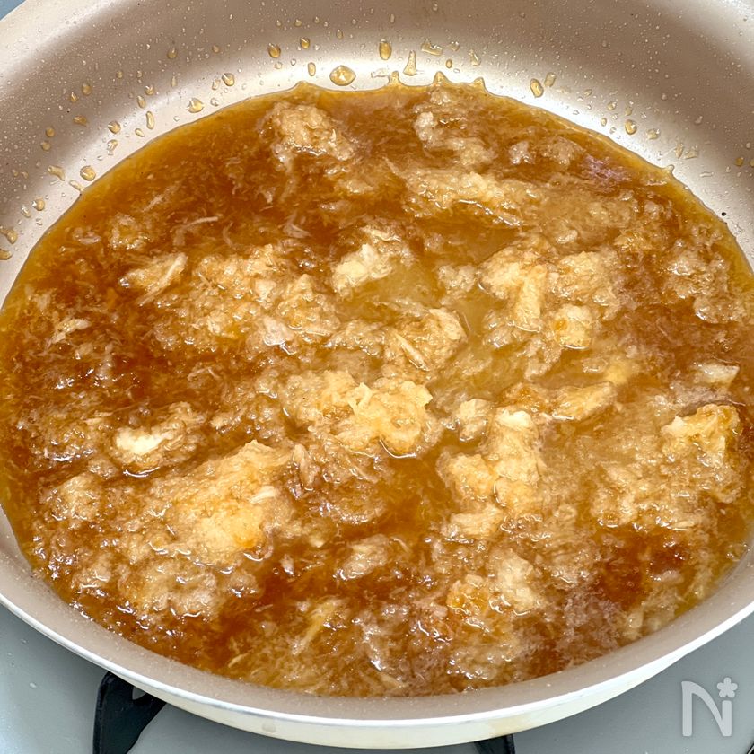 (4) 同じフライパンに、水気を絞った大根おろし・ポン酢を入れひと煮立ちさせてからハンバーグかける。