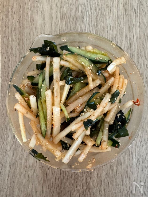 (1) 大根ときゅうりは、塩小さじ1/2をまぶし、5分置いたら、すすいで、水分を拭く。