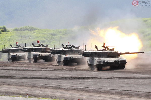 富士総合火力演習で行進射撃を行う90式戦車。実戦でこのような戦い方をすると敵の集中砲火をくらう(2012年8月、柘植優介撮影)。