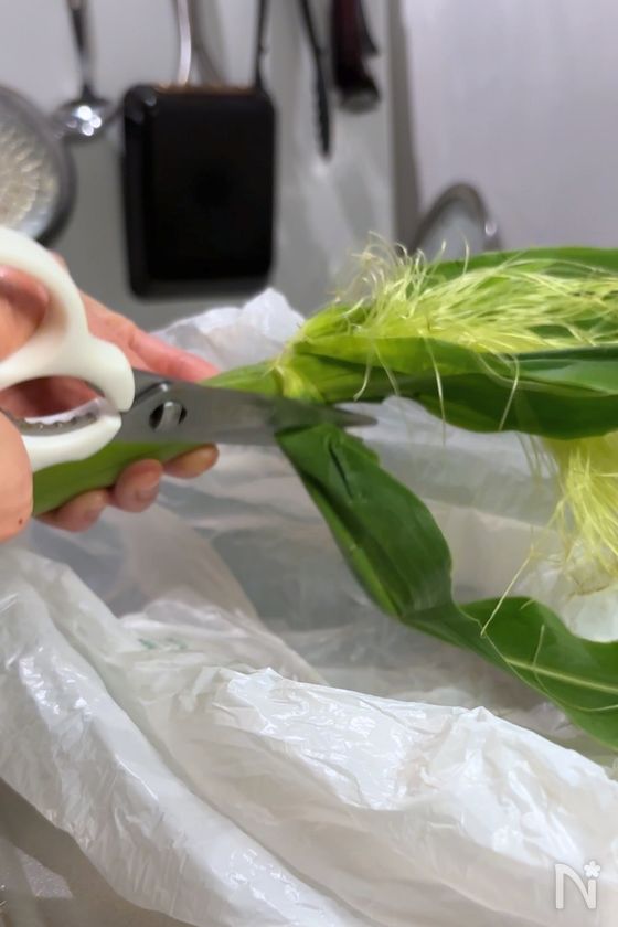 (1) 皮付きヤングコーンの濃い緑色の葉っぱ、茶色くなっていたり長すぎたりするヒゲをハサミで切り落とす。