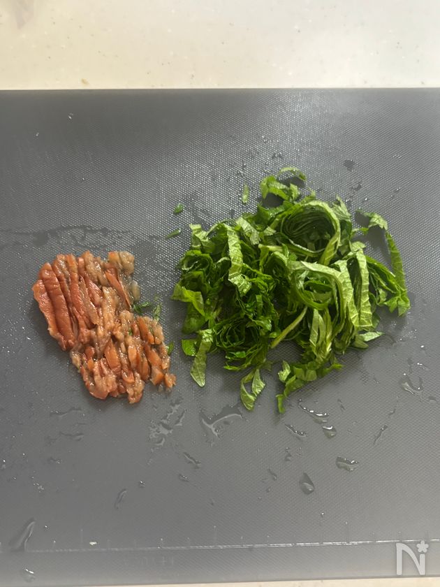 (3) ①の塩をいったん洗い流したら、ひとつかみずつ水気をぎゅっと搾ってボウルに戻す。②の梅、大葉と【A】を加えて和える。