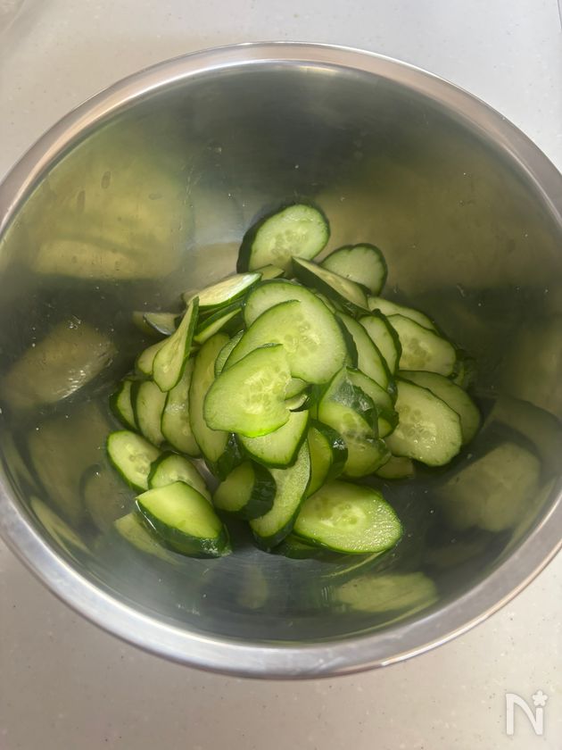 (1) きゅうりは斜め薄切りにしてボウルに入れ、塩を揉み込み10分(以上)おく。