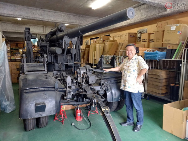 先日、そのような造形企業の本社倉庫を筆者(吉川和篤:軍事ライター/イラストレーター)が訪ねてみると、会社の隅に驚くべきモノがありました。その物体は色々な段ボール箱に遮られるようにして置かれていましたが、濃いグレー色に塗られた「長砲身の巨砲」は、そのような中でも隠し切れない存在感を放っていました。