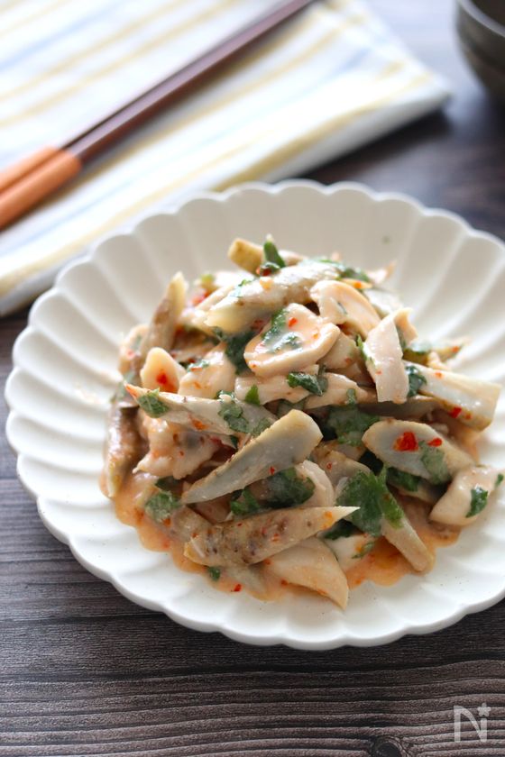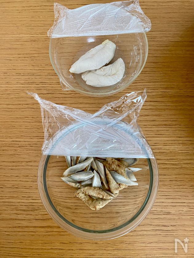 (1) ボウルにごぼう・ささみ・【A】をいれて混ぜる(ささみは筋を取り除き、手でひと口大にさいていれる)