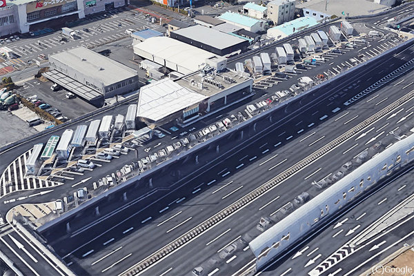 人工地盤上に駐車場がある京葉市川PA。下り線だけのPAだが、京葉道路の上り線側に立つ(画像:Google)。