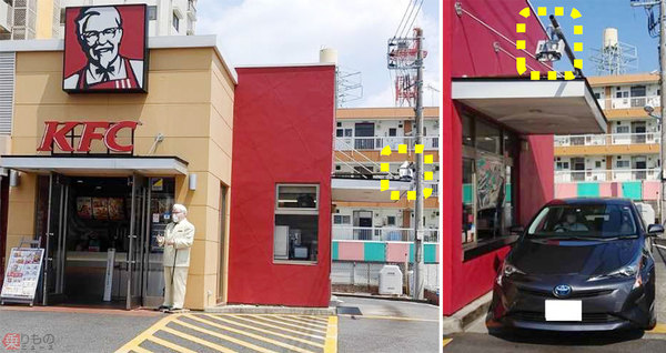 ETCアンテナ(黄枠)が設置されたケンタッキーフライドチキンのドライブスルー(画像:NEXCO中日本)。
