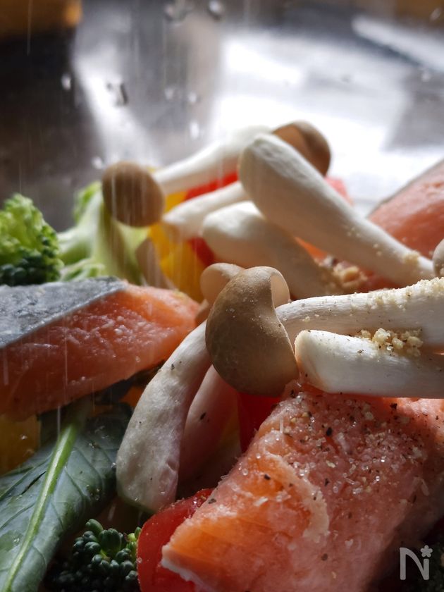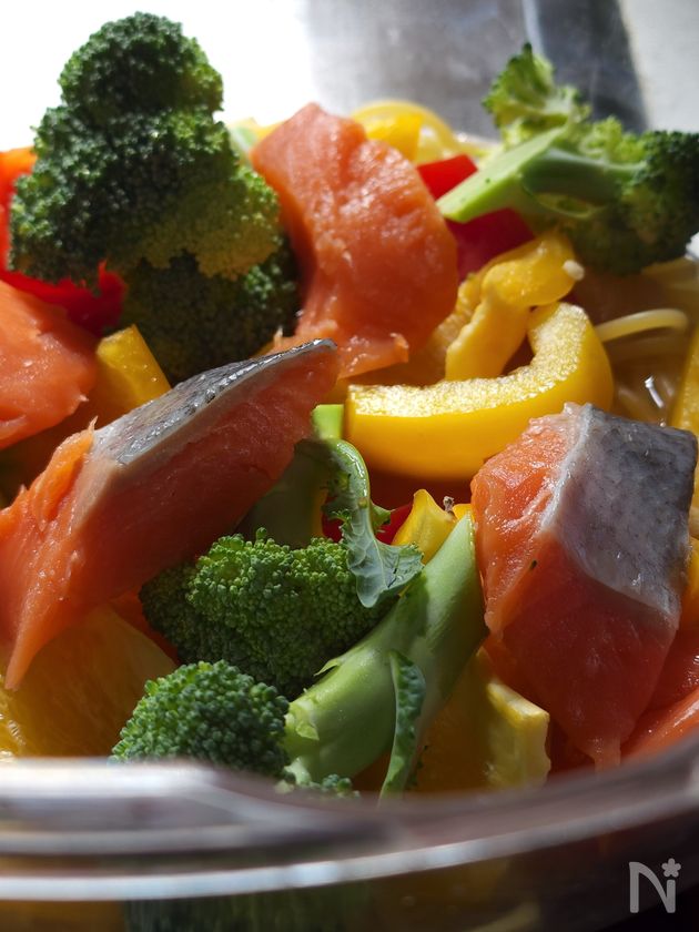 (5) 4の上に2・3をのせ、一口大に切った生鮭をいれる。