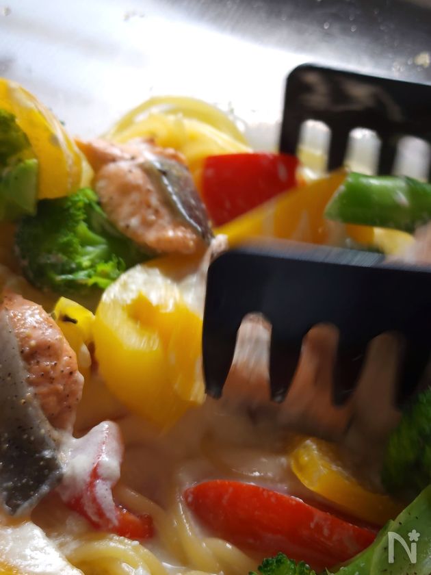 ・野菜を鮮やかに仕上げるため、クリーム分離を防ぐために時間差で加熱しています。