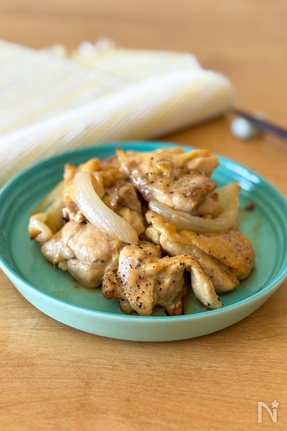 (1) 玉ねぎの皮を剥きくし形に切る。鶏もも肉を一口大の大きさに切り、厚みがあるところは1.5~2cm厚にする。