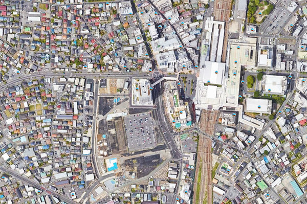 所沢駅の左側に開発用地が拡がる。かつての所沢車両工場(画像:Google)。