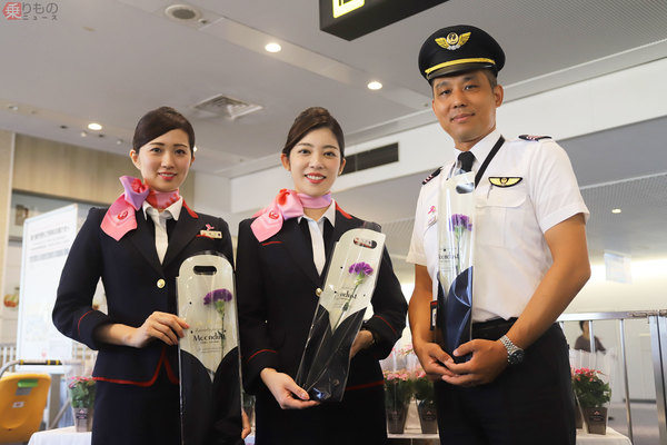 JALが「ピンクリボンフライト」を運航。乳がんの啓発活動である「ピンクリボンキャンペーン」の一環です。客室乗務員はピンクのスカーフを、運航乗務員はピンクの肩章を着用しました。