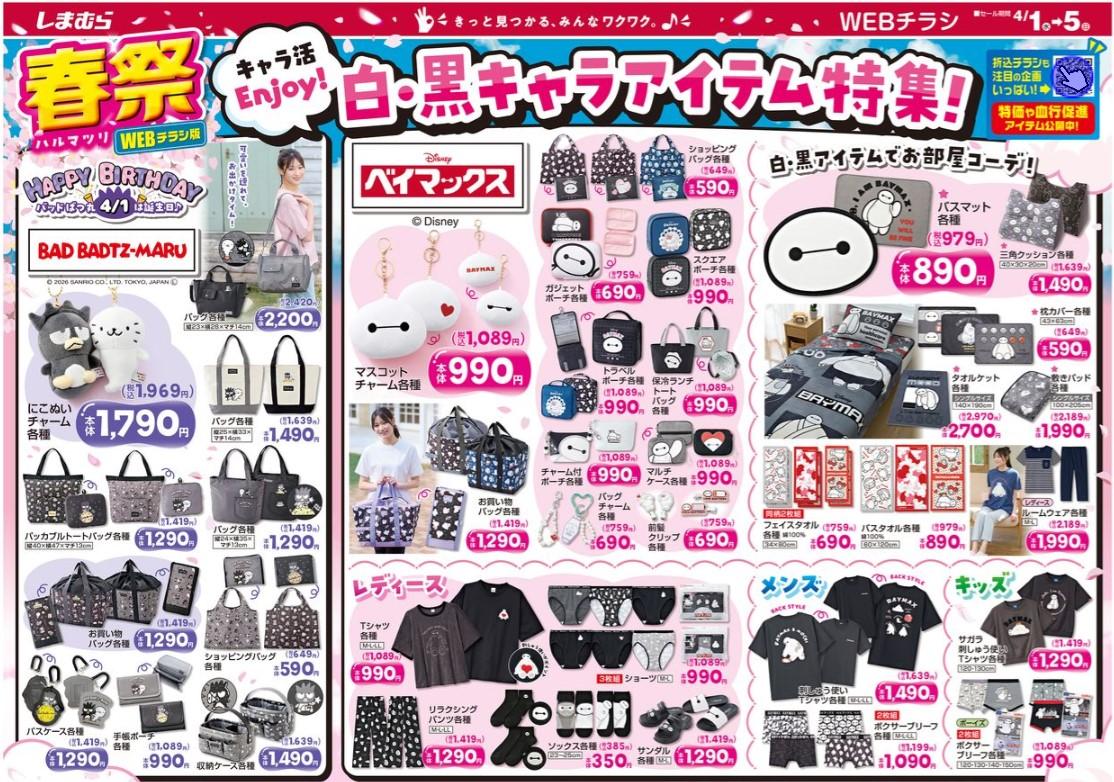 4月1日はバッドばつ丸の誕生日。にこぬいチャーム各種(1969円)、バッグ各種(1419円~2420円)、収納ケース各種(1639)円など、大人が持ってもおしゃれなモノトーンアイテムが勢揃いです。