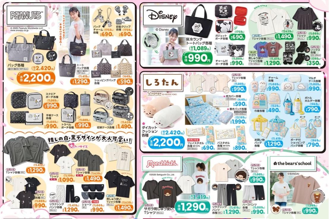 その他、PEAUNUTSの使い勝手抜群のバッグ各種(2420円)、大人可愛いTシャツ各種(1089円~1639円)や、Disneyのレディース向けTシャツ(1089円)、キッズ向けサガラ刺しゅう使いTシャツ各種(1419円)、保冷ランチトートバッグ各種(1089円)など、これからの季節に外せないアイテムも盛りだくさんです。
