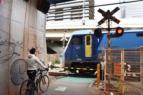 横浜の「三菱ドック踏切」。貨物線の途上にあり、貨物列車が頻繁に走るが、踏切を渡る通行者も意外と多い(小川裕夫撮影)。