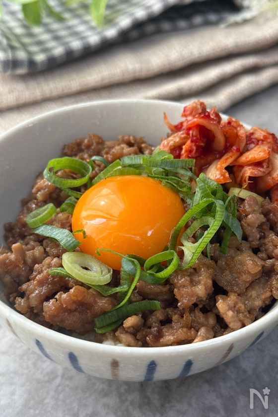 (4) お茶碗に白米を乗せて、そぼろ、卵黄、大人はお好みでキムチを盛り付ける。