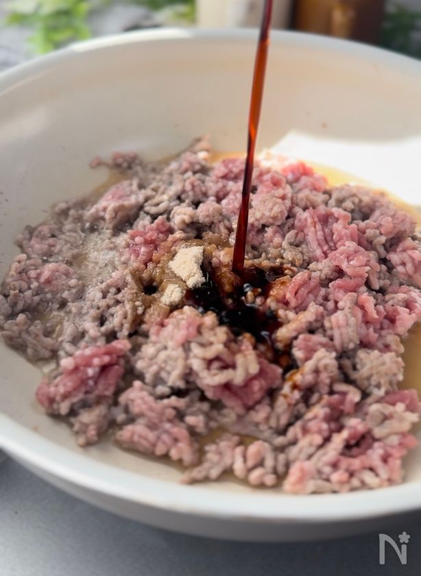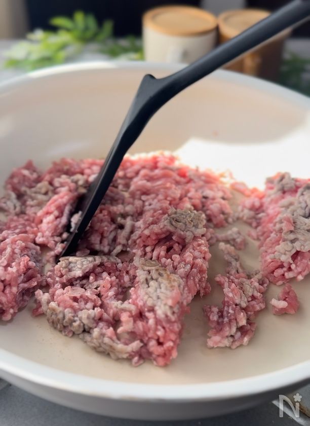 (1) フライパンに豚ひき肉と塩こしょうを入れて、半分くらい火が通るまで炒める。