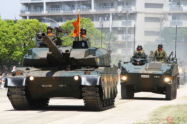 玖珠駐屯地に所在する西部方面戦車隊の前身である第4戦車大隊の10式戦車と96式装輪装甲車(柘植優介撮影)。