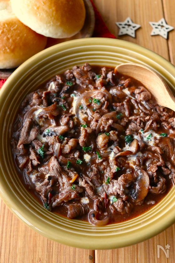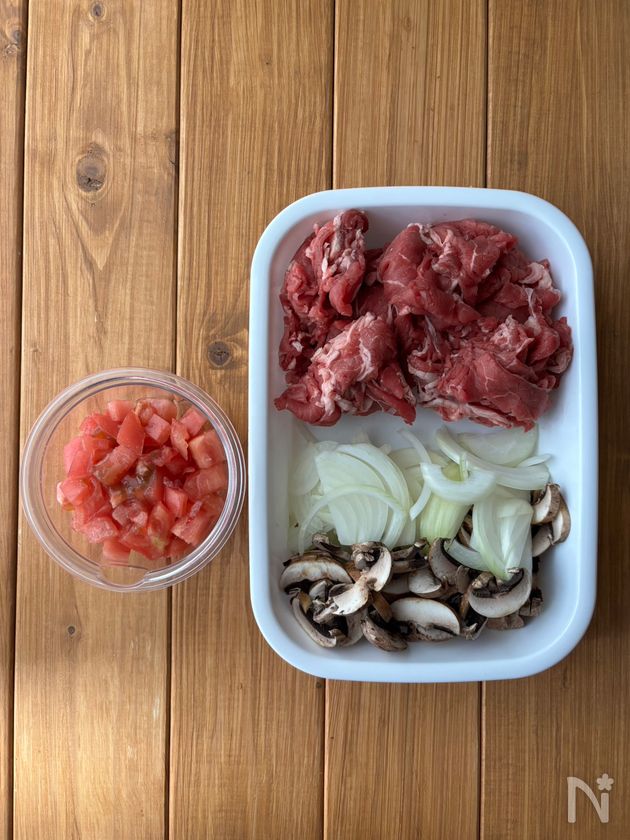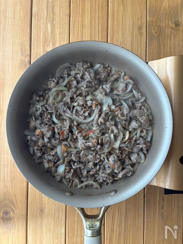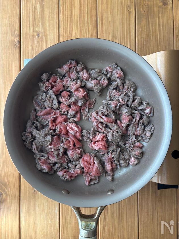 (2) 中火で熱したフライパンに牛こま切れ肉と【A】を加えて炒める。