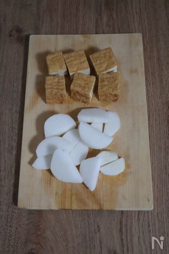 (下準備) 大根は厚さ1cm程の半月切り、厚揚げは幅5cm程に切る。