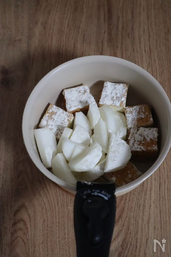 (1) ①中火で熱した鍋にサラダ油をひき、薄力粉を全体にまぶした大根と厚揚げを入れ、粉っぽさがなくなるまで軽く炒めたら【A】を加え、煮立ってきたら弱火にして落とし蓋をして5分程度煮込む。