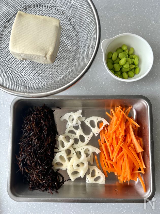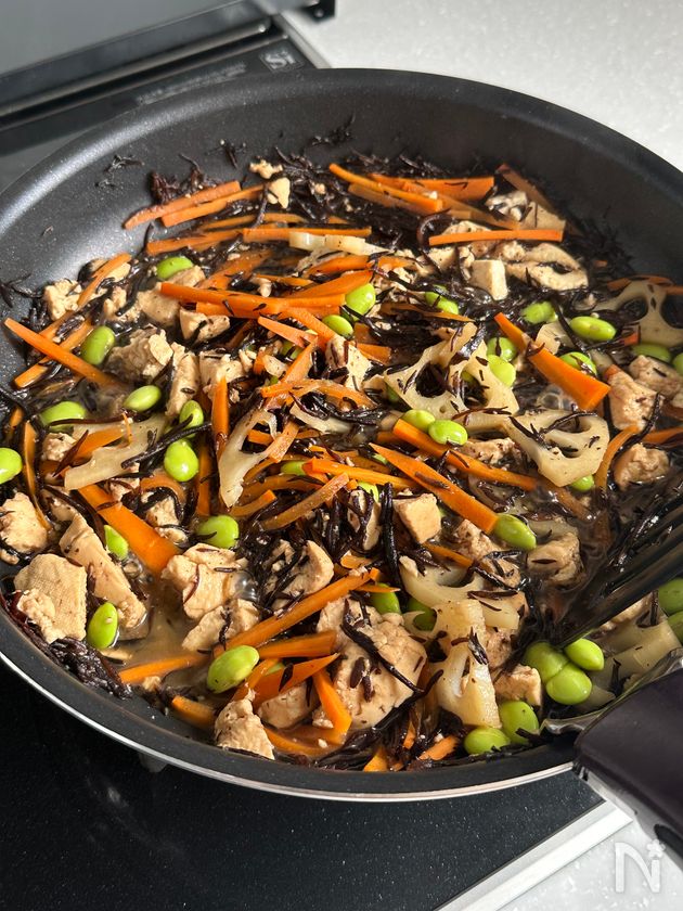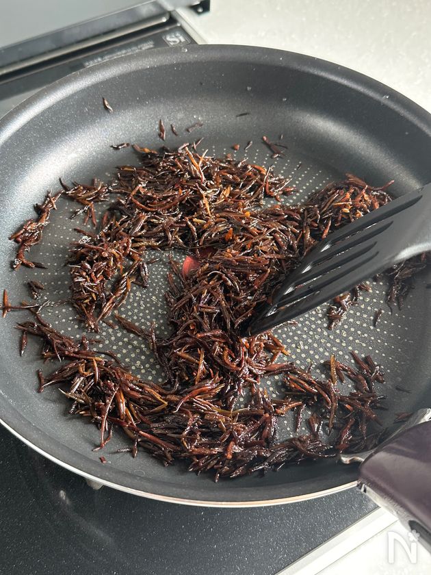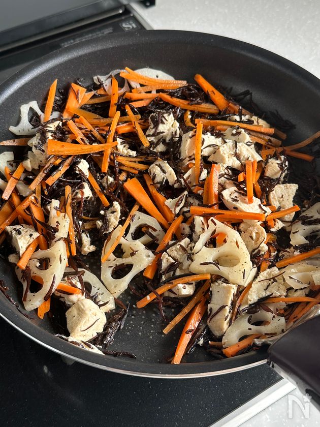 (3) フライパンにごま油とひじきを中火で熱し、全体に油が回るまで炒めたら、にんじん、れんこんを加えてさっと炒める。