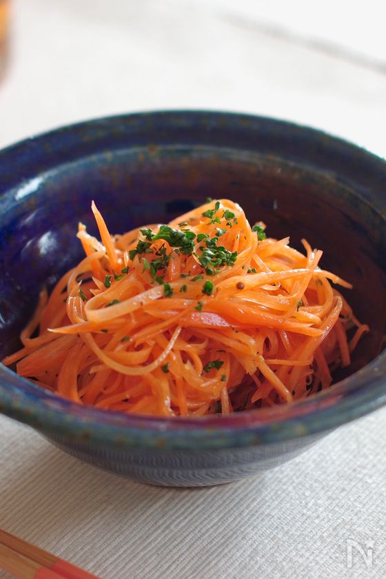 (1) にんじんを千切りにする。(スライサーを使うと簡単です。)パセリはみじん切りにする。