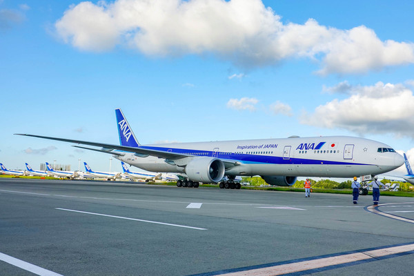 ANAのボーイング777-300ER型機。撮影は国際線が多く就航する成田空港(2020年、乗りものニュース編集部撮影)。