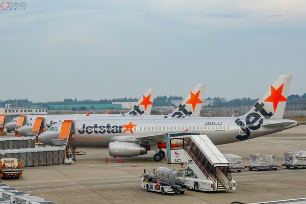成田第3ターミナルに乗り入れるジェットスター機(乗りものニュース編集部撮影)。