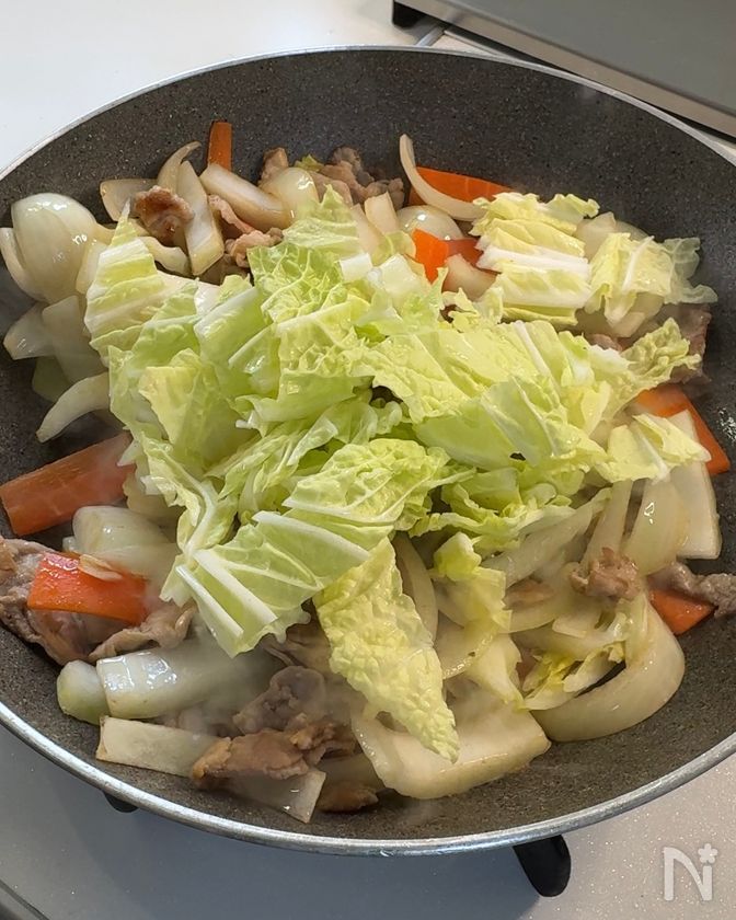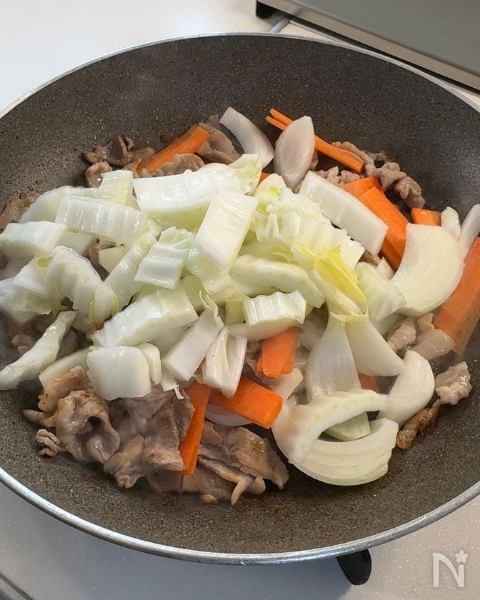 (2) 豚肉に火が通ったら、にんじん・玉ねぎ・白菜の芯の順に加えて炒める。