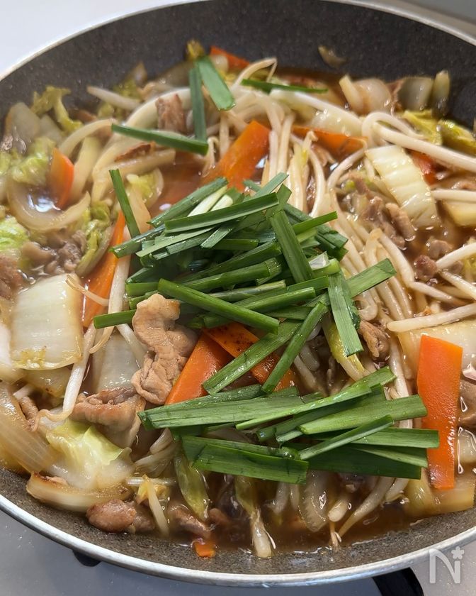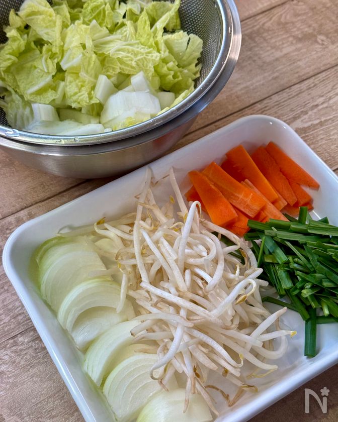 (下準備) ・玉ねぎは薄切り、にんじんは細切り、白菜はざく切り、ニラは5cm長さに切り、豚こま切れ肉は食べやすい2cm幅に切る。