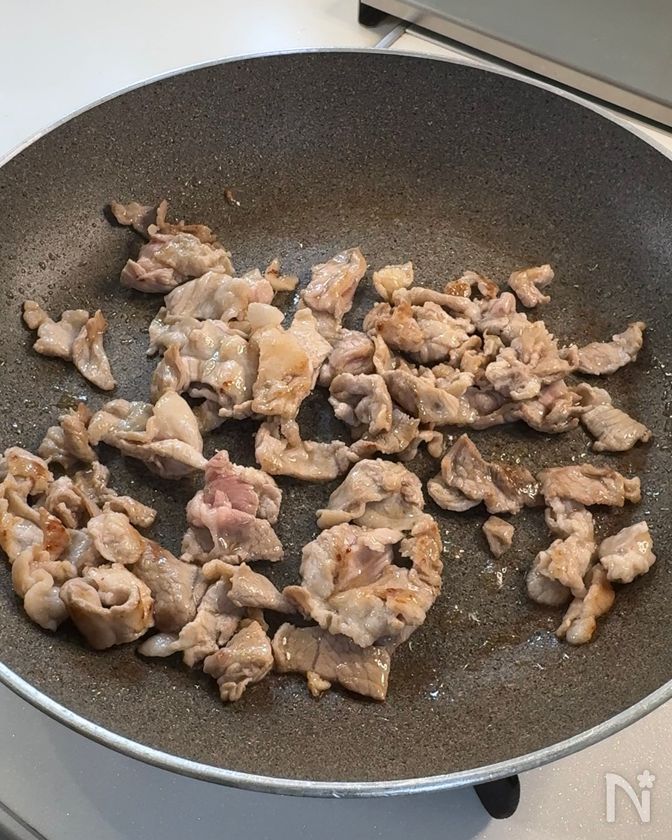 (1) フライパンにごま油を入れて中火で熱し、豚こま切れ肉を加えて色が変わるまで炒める。