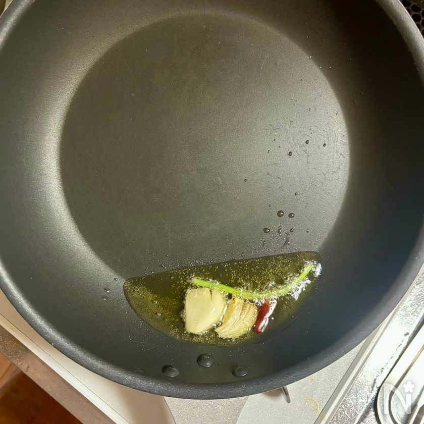 工程3では、にんにくを弱火でじっくりと加熱し、香りを油に移します。