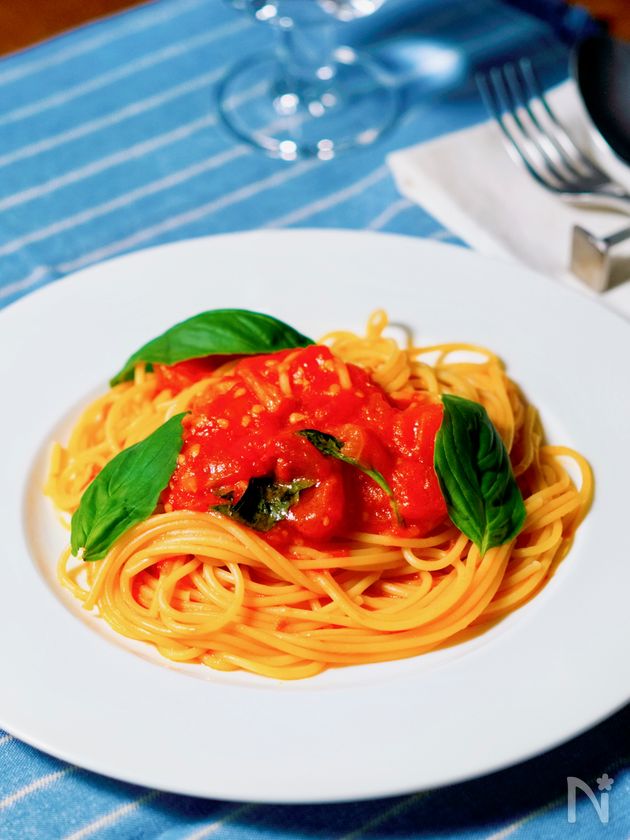 中火にし、トマトの形がほとんどなくなるまでさらに5〜7分煮て、バジルの茎を除いて塩で味をととのえる。