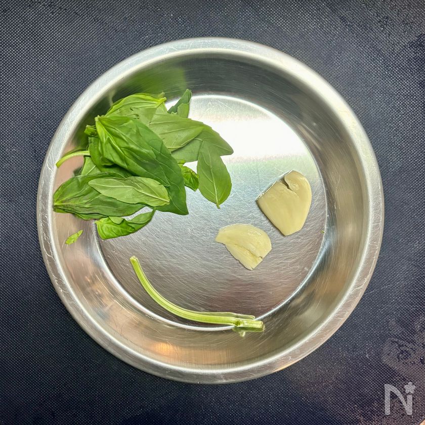 バジルは葉を摘んでトッピング用に少し取り分け、茎は取りおく。