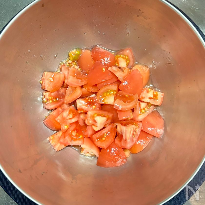 トマトをボウルに入れ、【A】をふってまんべんなく混ぜ、10分ほどおく。
