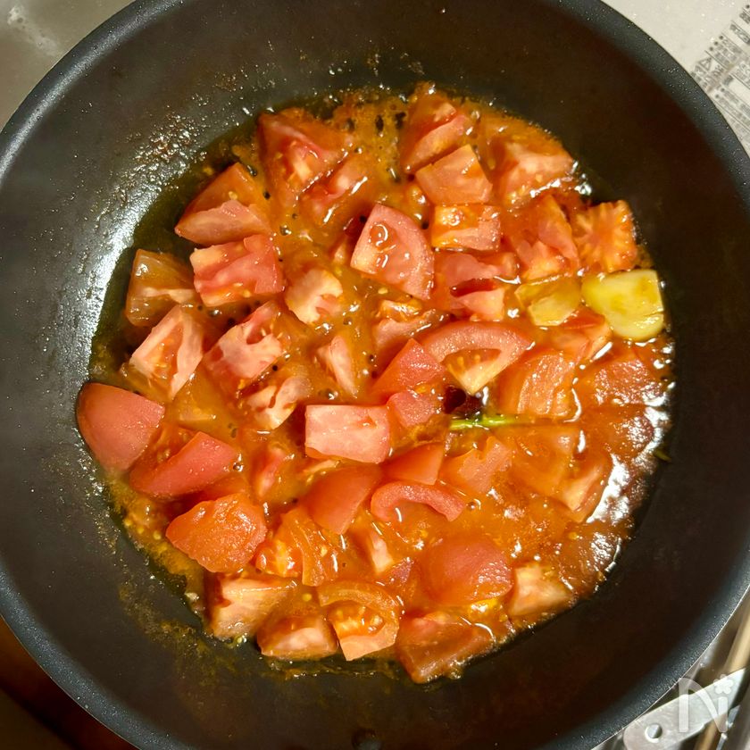 (4) 2のトマトを加えて強めの中火で5分ほど煮る。