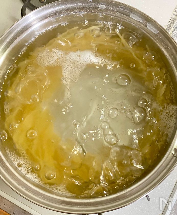 (5) 鍋に塩分濃度1.4%の湯(湯1.5リットルなら塩21g)を沸かし、スパゲッティを袋の表示時間通りにゆでる。
