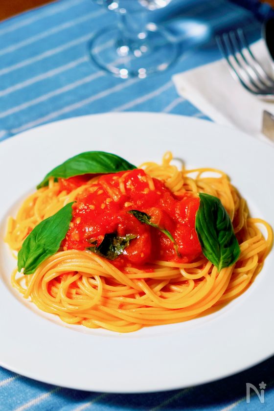 (2)熱湯(スパゲッティをゆでる湯でよい)に10秒ほどくぐらせ、すぐに冷水にとって冷やし、皮をむく。