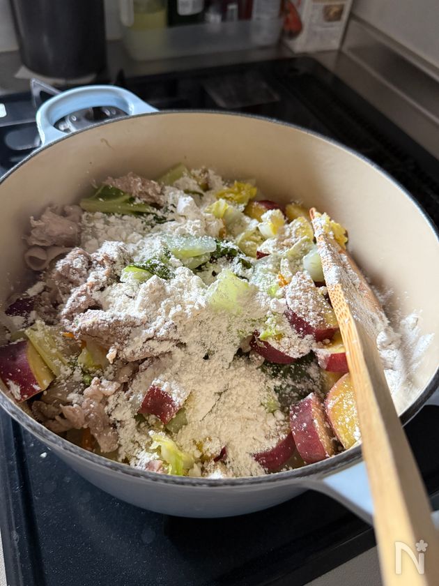 (4) さつまいもに火が通ったら蓋を外し、薄力粉をまんべんなくふり入れ、粉っぽさがなくなるまで炒める。
