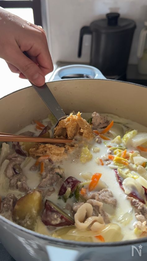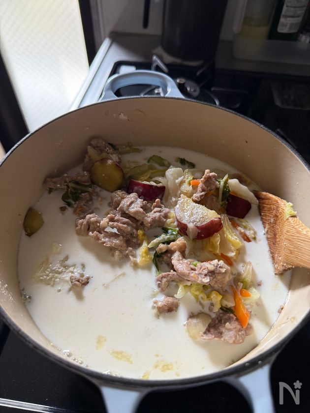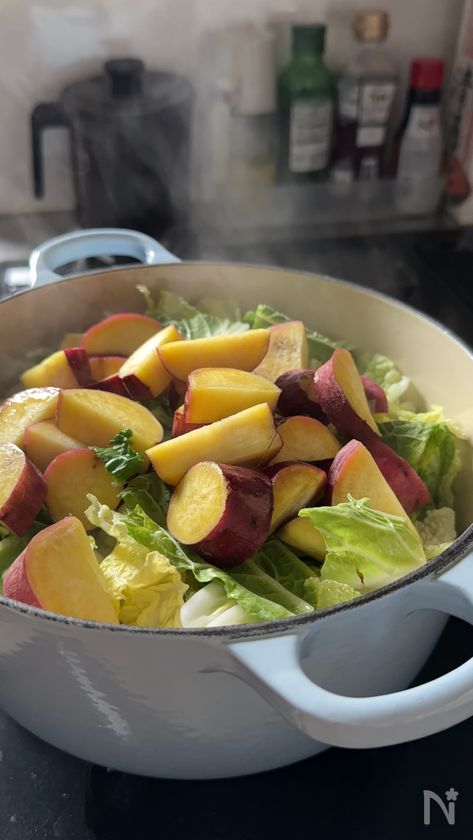 (3) 水気を切った白菜、さつまいもを加えて蓋をし、蒸し焼きにする。