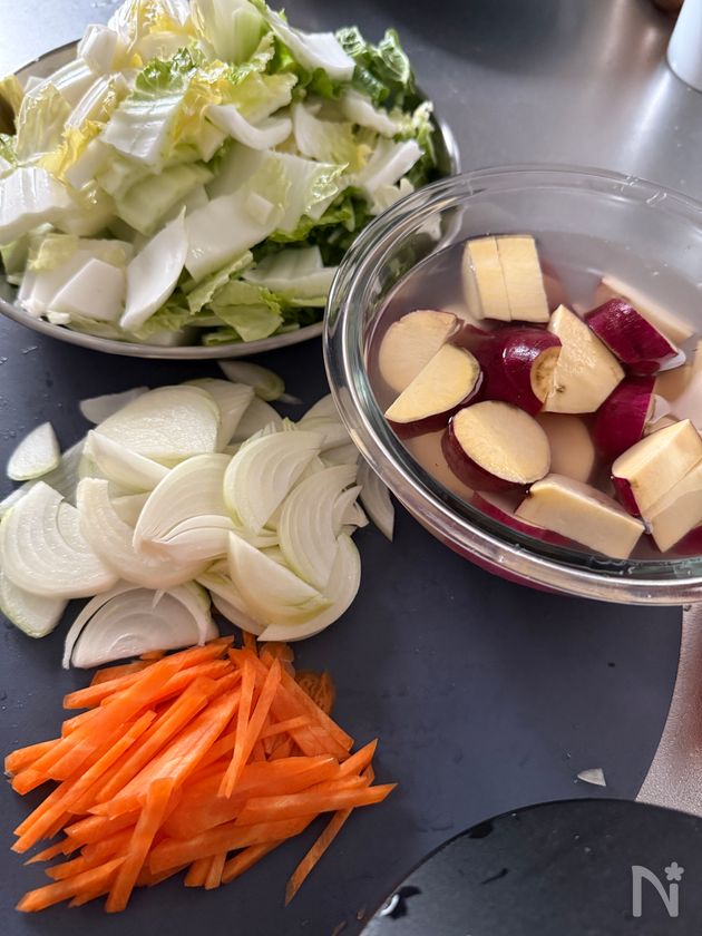 白菜は3cm角に切る。玉ねぎは薄切りに、にんじんは3〜4mmの千切りにする。