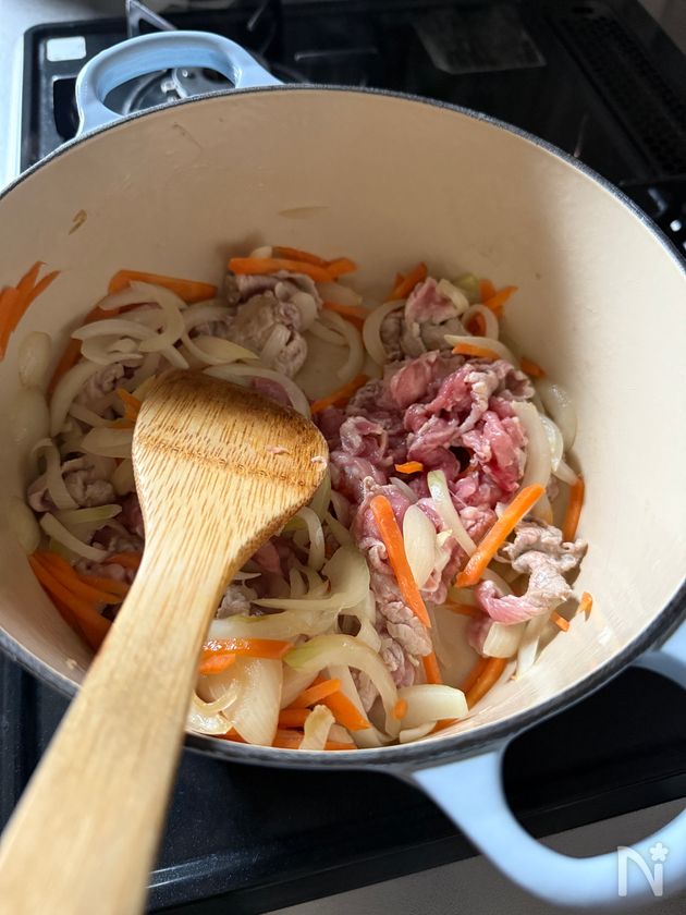 (2) 鍋にサラダ油を引いて玉ねぎ、にんじん、豚細切れ肉をさっと炒める。